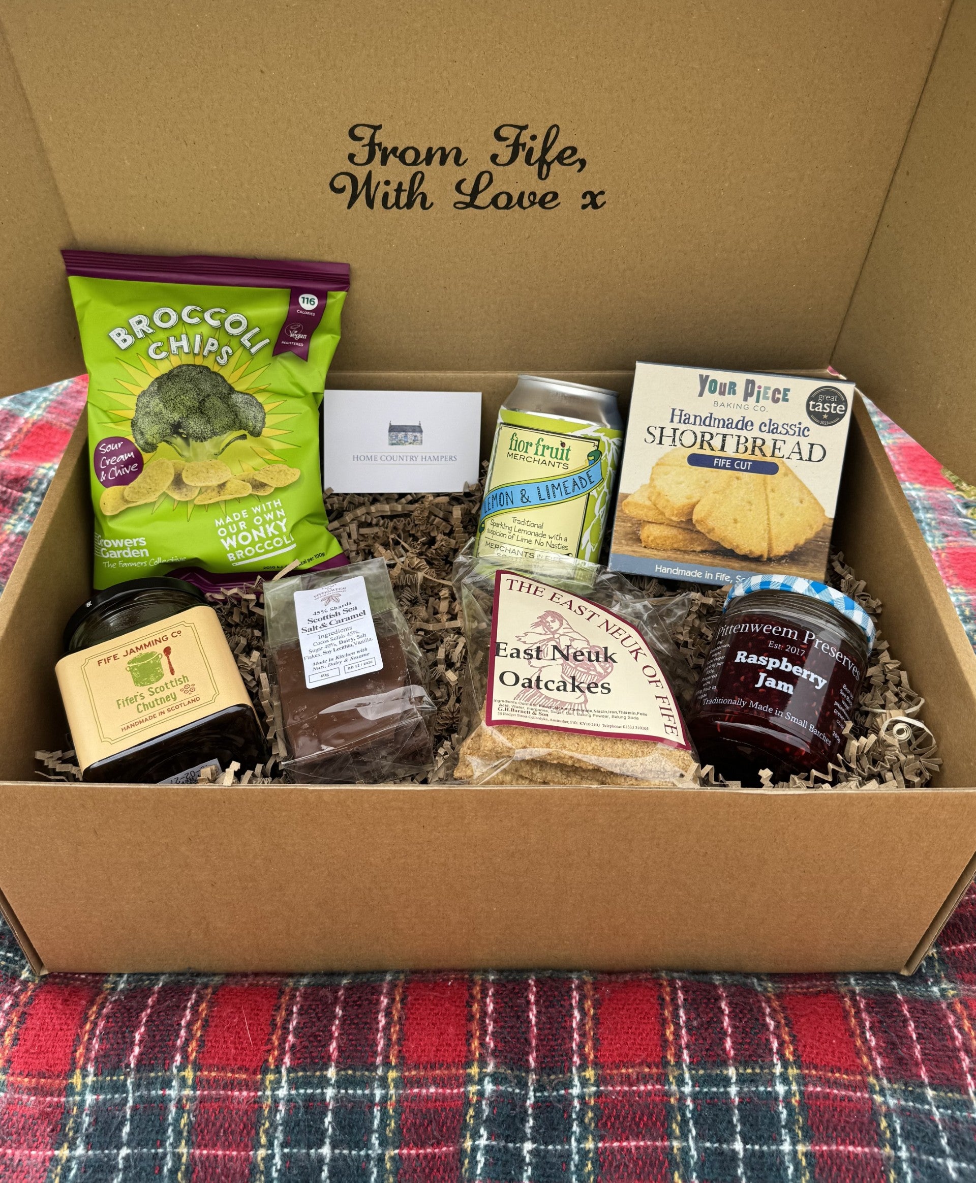 Our 'From Fife with Love Hamper' is a Scottish gift box filled with delicious artisanal Fife products. Every product is lovingly selected and curated by myself, Laurie! I champion local businesses and supports my community with every hamper.